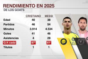 直播吧12月31日讯 今天是2025年的最后一天,ESPN盘点并对比了40岁的C罗和38岁的梅西在今年的数据。