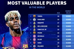 直播吧1月1日讯 2025年已经结束,《转会市场》也列出了当前全球身价榜前二十的球员,亚马尔、哈兰德和姆巴佩均2亿欧最高。
